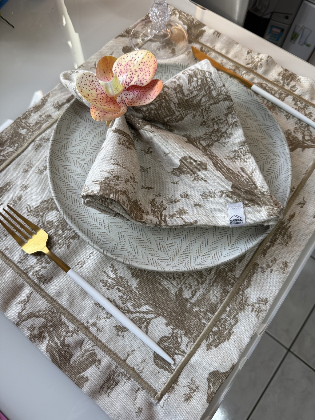 4 Lugares Americanos face única em tecido linho com acabamento em canto mitrado e bordado . Medida aproximada: 46x36